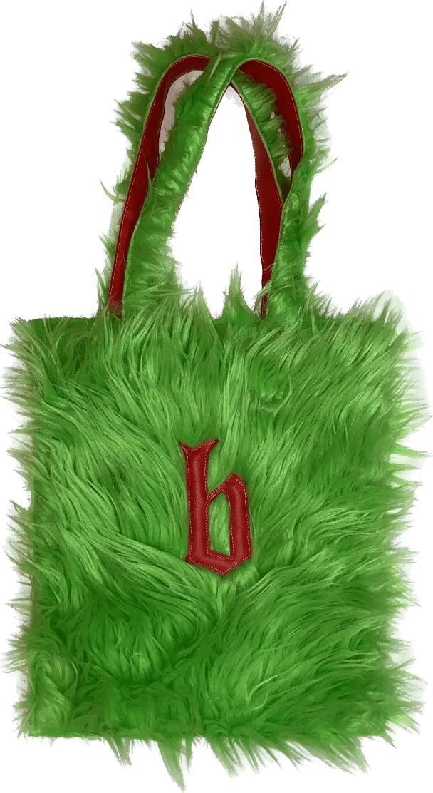 -green faux fur and red vinyl handles