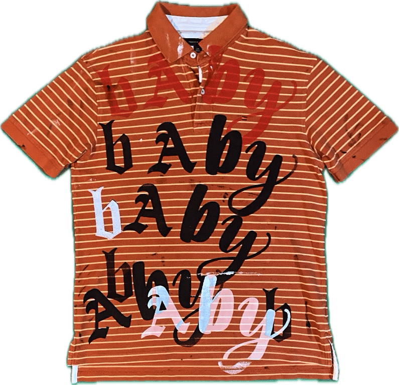 -1/1 reworked “tommy hilfiger” polo -black/red/white screen printed “BABY” logo - MENS SMALL -inseam : 4.5” -outseam : 8” -shoulder : 18.5” -chest : 19” -front length : 26.5” -back length: 28.5” -bottom : 22”